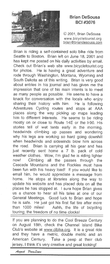 Meanwhile, it was somewhere around today that an article was written about me in the local bicycle club newsletter.