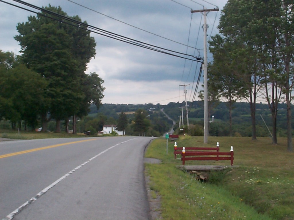 Much of New York has glacial valleys that run north-south – just look at the Finger Lakes on a map and you’ll know what I mean. So a cyclist heading east on US 20A will encounter steep climbs followed by short screaming decents. When cresting a hill you can see the next hilltop at eye level, with the road dropping straight down and then back up in between. In a world without friction or air resistance I would be able to coast on the downhills, retaining the momentum to get up to the next peak – but of course the real world doesn’t work that way!