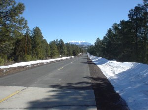 Rolling out of Flagstaff, I was feeling comfortable in the 23 degree temperatures. That was short lived, because once I left town, I could feel the strong headwind, which I later learned brought the wind chill down to 12 degrees. The first part of the ride had only pieces of the original Route 66, thereby requiring use of the I-40 shoulder in some places (legal in most western states outside of urban areas). So I alternated between some protection from the wind due to the pine trees along parts of the old highway, and no protection at all from the wind on the wide open sections of I-40.