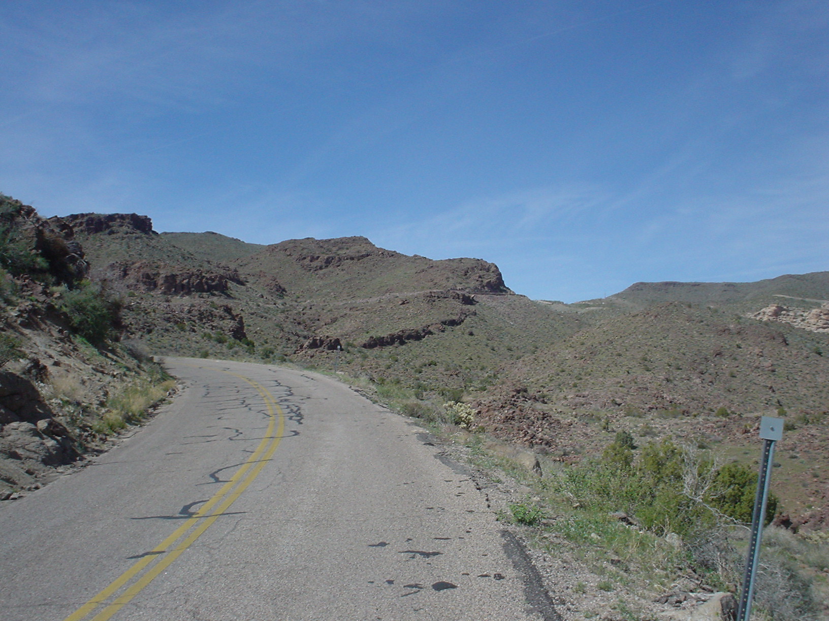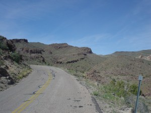 After passing Cool Springs, the road got real narrow and started to switchback its way up. Posted speeds for the turns were usually 10 or 15 mph. Traffic was fairly light – a few motorcyclists and some snowbirds too, neither of which were in a hurry. The views down to the desert floor were stunning.