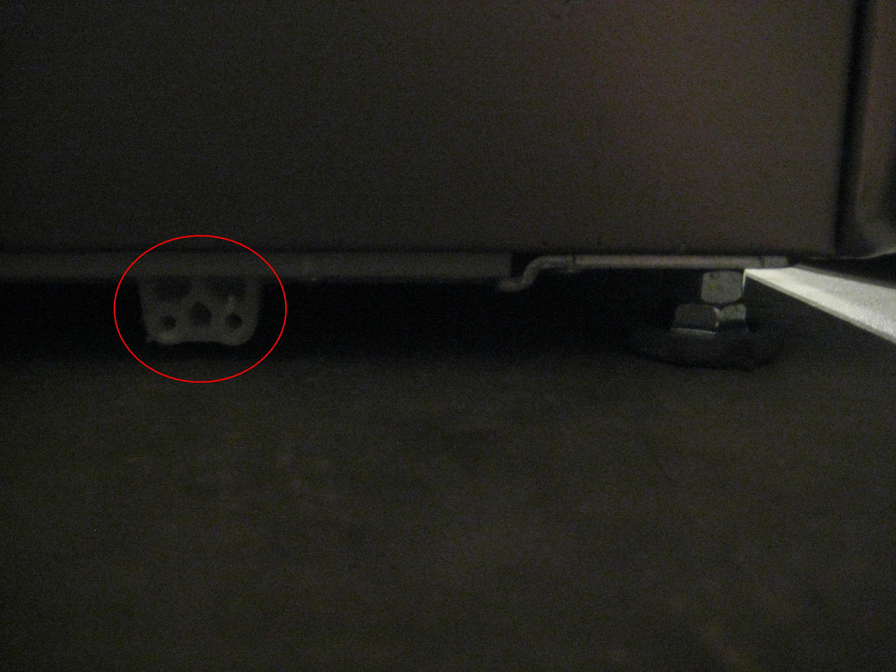 Here’s the front left of the bottom of the washer, notice the white retainer circled in red. Screws pass through the holes on the pedestal and then screw into four white retainers, one at each corner of the washer. But the dryer had no such retainers, and they did not come with the pedestals.