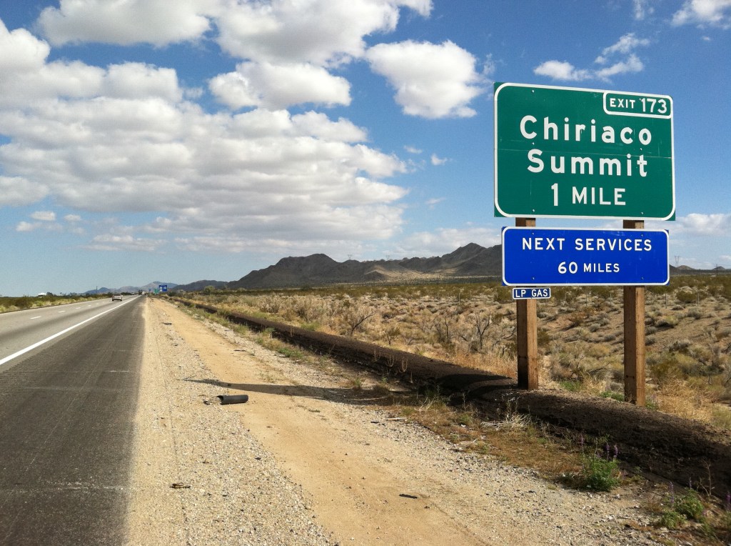 I-10 is the only road out to the east, so we (legally, for this rural stretch) headed up the ramp and onto the freeway shoulder. And that’s where the relentless (well, on a bike) uphill climb continued for most of the 26 or so miles to Chiriaco Summit, the only place with a gas station and a restaurant between Indio and Blythe. (Though tomorrow I would find out that there is a cafe in Desert Center.)