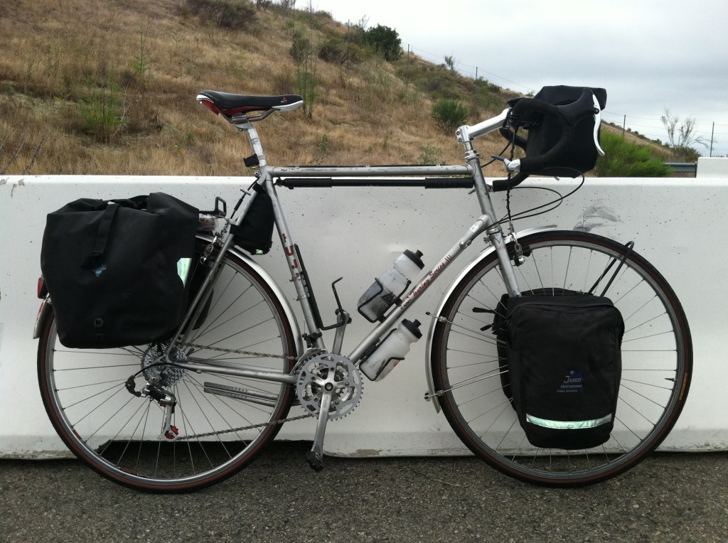 I carried camping gear when I bicycled across the US back in 2001, but most of my bicycle trips since then have been shorter duration “credit card” tours, traveling lighter and staying in hotels. It was time to dust off the front racks and panniers and mount them to the touring bike, throw the camping gear and other stuff in my bags, and go for a shakedown ride with the bike fully loaded. The bike handled quite well, although slow of course!
