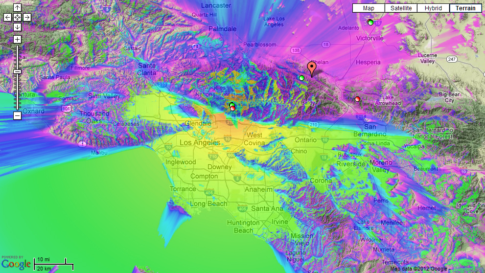 Here’s a detailed map for one of the VHF stations broadcasting from Mount Wilson (top center on the map). My cabin in Wrightwood is indicated by the red pointer in the top right center.