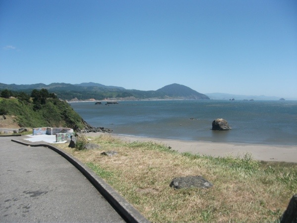 Although it was downhill along North Bank Rogue Road to US101, we had the wind in our face most of the time. Then we crossed the bridge over the river into Gold Beach, and we got our tailwind back!