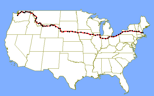 The tour began in Seattle and ended in Boston, using a route I pieced together from various sources: bicycle maps from Adventure Cycling’s cross country routes, web sites from commercial bicycle touring companies, state department of transportation bicycle maps, and conventional road maps.