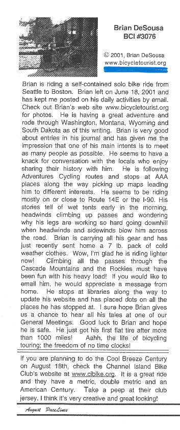 My local bicycle club did a writeup of my trip in their monthly newsletter.