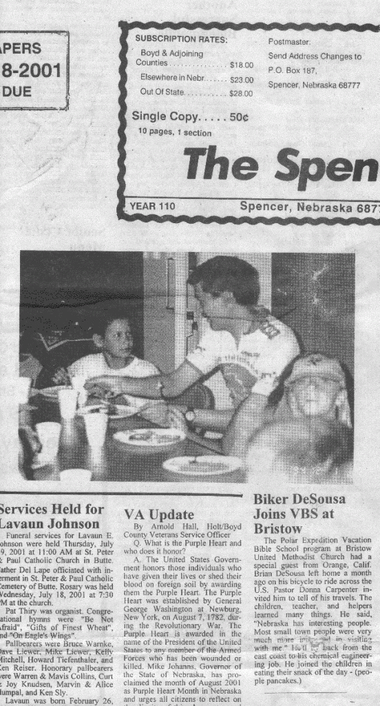 There are lots of friendly people in the state who will talk with you forever if you let them. When I stopped for a drink in one town a lady came over from across the street and asked if I could talk to the kids at the vacation bible school across the street. I did, and there was an article in the local newspaper about it.